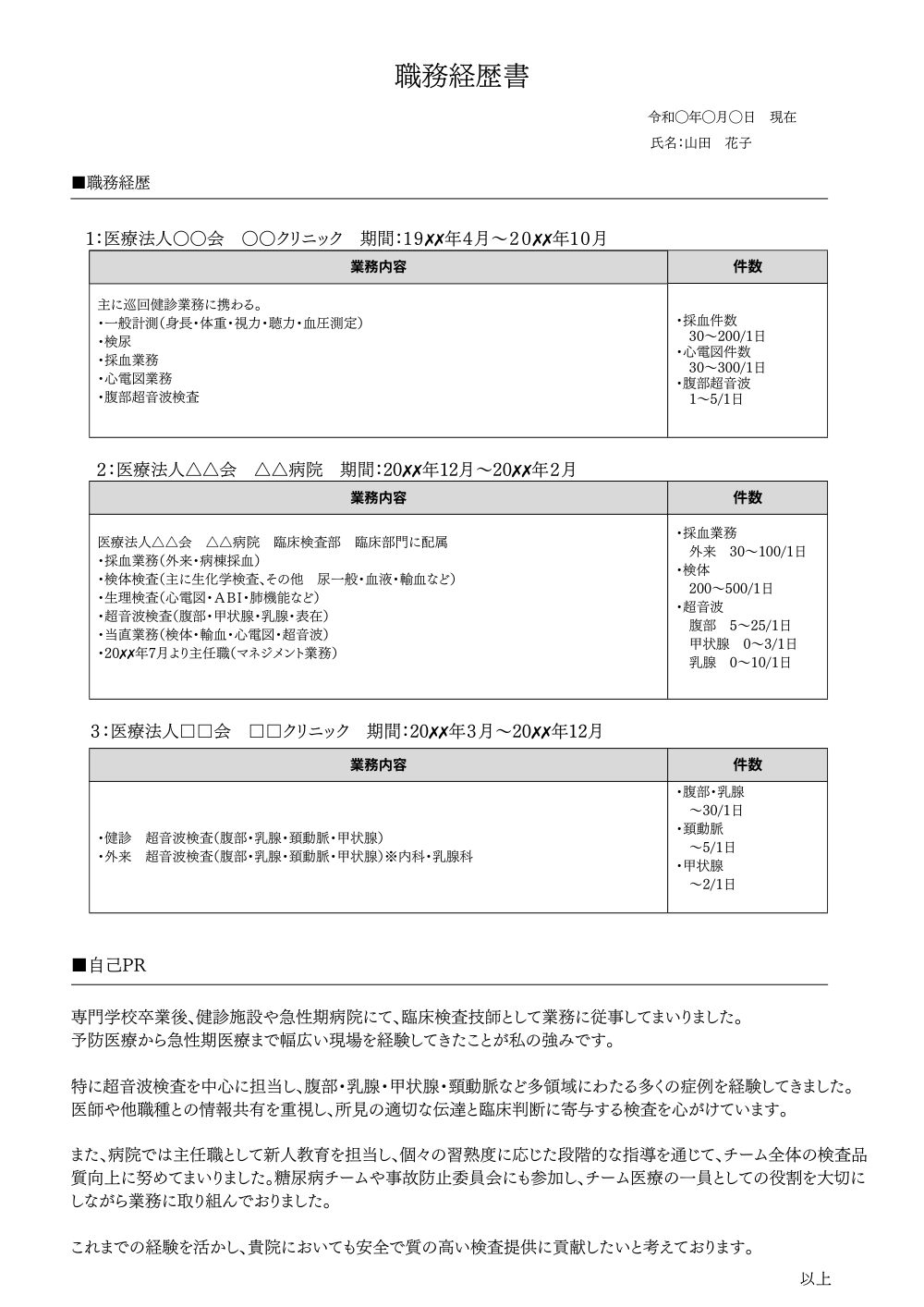 たとえば、エコー経験者を募集している施設なら、エコーの経験を手厚く書く。